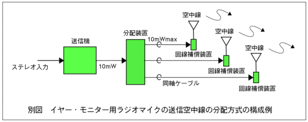 無線設備規則第49条の16の4,5,6各号に「ステレオ伝送方式のものにあつては……」とステレオ伝送が可能になるとともにその技術的条件の追加が行われました。「イヤモニはステレオで」という強い要望から特定ラジオマイクのステレオ化が実現。高度化を目指した今回の改正の一番大きな項目でもあります。 空中線 複数アンテナの分散配置が可能 特定ラジオマイクは無線設備規則第49条の16の2で「一つの筐体に収められていること。」同16の9で「給電線及び接地装置を有しないこと。」と定められ、送信アンテナは機器本体への直付けしかできできないことになっています。これを今回の改正では郵政省告示(第315号及び第316号)で「特定ラジオマイクの陸上移動局の無線設備の一の筐体に収めることを要しない装置」と「無線設備規則第49条の16の9規定を適用しない無線設備」に、イヤー・モニター用ラジオマイク(この告示で初めてこの名称が使われています)が加わり、イヤモニの場合は分配装置や回線補償装置を使って、かなり自由なアンテナシステムが組めるようになりました。 空中線電力10mWでステレオ伝送するとサービスエリアはかなり小さくなってしまい、大きなホールなどでは舞台全域をカバーできなくなります。これを補償するためにとられた処置といってもいいと思います。 別表に特定ラジオマイク(A型ワイヤレスマイク)とイヤー・モニター用ラジオマイクの技術的条件の比較を、また別図でイヤー・モニター用ラジオマイクの送信空中線の分散配置方式の構成例を示します。 ![]() [三つ巴の運用調整] 運用調整をどうするかも、前述の通り検討時に問題となった一つですが、電通技審の報告書には「800MHz帯FPUとA型ラジオマイク間、及びA型ラジオマイク相互間の混信を避けるため、特定ラジオマイク利用者連盟が運用調整を行い、円滑な利用が行われている。イヤー・モニター用ラジオマイクについても、利用する場所や利用者はA型ラジオマイクと同じと考えられることから、A型ラジオマイクとして位置付け、これまでのA型ラジオマイクと同様の運用調整の下で利用することが周波数の有効利用の観点から適当であると考えられる。」と記されています。特ラ連の運用調整の実績がこのような報告書で認められたことは、これまでの努力の成果であり、光栄なことですが、今後のイヤモニも含めた三つ巴の運用調整を考えると責任の重さを感じます。 会員ならびに放送局のみなさまの一層のご協力をお願いする次第です。 別表 イヤー・モニター用ラジオマイク特定ラジオマイク(A型ワイヤレスマイク)技術的条件の比較