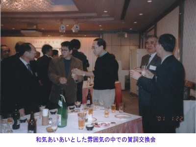 | 特定ラジオマイク利用者連盟の2001年新年賀詞交換会は1月22日、今年初の理事会後午後6時から、東京都北区『北とぴあ』芙蓉の間で開かれました。出席者は50数名、和やかな雰囲気のなか、8時を過ぎるまで歓談しました。 |