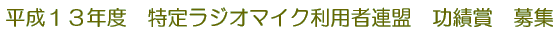 平成12年度の功績賞は特ラ連レポートに掲載しましたのでご覧になったと思いますが、バラエティに富んだ内容でした。 今年も募集は下記の要領で行いますので、自薦他薦を問わずふるってご応募ください。 <選定の対象と種類> 平成13年1月1日から平成13年12月31日までの1年間において下記に該当すると思われるものをご推薦ねがいます。 主にワイヤレスマイクの技術・運用を対象に広く考えていただきたいと思います。 なお、受賞者には功績に見合った記念品を用意いたしております。