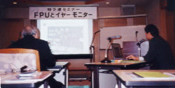 アコースフィア(ギターデュオ)のお二人に実際にイヤモニをつけてもらい、その電波を15台のイヤモニで受信し来場者の全員に聞いていただき、共立の加藤さんから注意点およびメリットを解説していただきました。