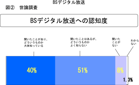 今年の2月に世論調査をしましたが、視聴者の側からいいますと、9割の人が聞いたことがある、と言っています。中味の認知度は4割しかないのです。受信機については8割の人が当面買わないと答えています。価格差については現在より2万円くらいまで下がってくれれば買ってもいいという人が4割です。番組の中身もさることながら、値段が高いということで普及につながっていかない、ということが分かります。