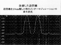 この図1と図2は、送信機2台を10cm離して電波を同時に出した時に送信機でIM(インターモジュレーション:周波数相互変調)により発生する電波を表しています。内側の2つの山が送信している電波でその外横の小さい山がIMによる電波です。改良された方の送信機は、従来の送信機より約20dBもIMによる電波の発生が抑えられていることが分かります。