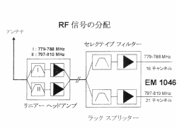 図3は従来のB型を含め34ch.仕様のアンテナシステムブロックダイアグラムです。アンテナブースターの後のラックマウントスプリッターで各周波数帯を細かくフィルターで分割しているのが分かります。一方、図4の改良した方のアンテナシステムは、アンテナのブースターに新開発のリニアーヘッドアンプを使う事とIMの発生を抑えた改良した送信機を使う事を前提に作られ、大きく2つに分けるだけでB型を含めた37ch.仕様を実現しています。