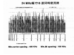 MHz幅で16 波同時使用すると第3次IM迄の計算で図7のようになり、電波的にはこんなに満杯の状態になってしまいます。図が小さく解かりにくいと思いますが、実際に使用する電波の周波数にはIMが発生していないのがわかると思います。もし、この状態でチャンネルプラン以外の周波数を送信すれば、チャンネルプランでせっかく作った電波の周波数にIMが発生してこのチャンネルプランの意味がなくなります。この状態では、使用中にIMによるノイズ、消音、等が起こる可能性があるという危険な状態になると言う事です。