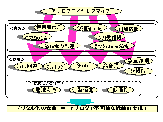 OFDMの普及、それらとの整合性を考えると、ワイヤレスマイクのデジタル化は必須のものとなろう。ユーザーの要求を充分検討した上で進める必要があろう。 |